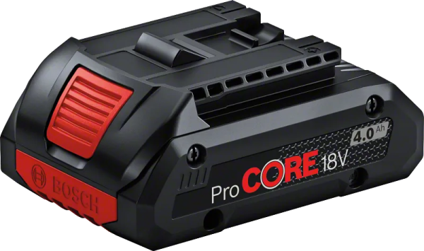 The ProCORE18V 4.0Ah Professional is the lightest and most compact battery in the ProCORE18V series. It features a new generation of cell technology that delivers the same performance as a standard 4.0 Ah battery but with optimized weight and size. This battery also incorporates COOLPACK 2.0 technology for superior heat dissipation from the inside out. Since heat can damage cells, this COOLPACK 2.0 technology provides up to 135% longer lifetime compared to standard batteries, allowing it to perform reliably during longer working sessions. It is compatible with all Bosch Professional 18V System tools and chargers, as well as the AMPShare battery alliance.